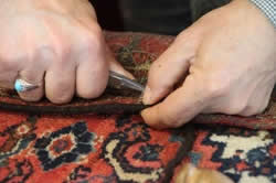 De kale plekken in een tapijt worden met een speciaal snij-instrument van oude wol ontdaan. Na een precieze vaststelling van de kleuren worden nieuwe strengen wol, die wij zelf verven, in de originele kleurnuances geheel handmatig ingeknoopt.