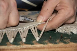 Franje kanten worden rechtdraads uitgehaald tot aan de eerste hele inslagdraad en worden origineel opnieuw ingeknoopt. De baard wordt vervolgens met een ketting vastgezet.